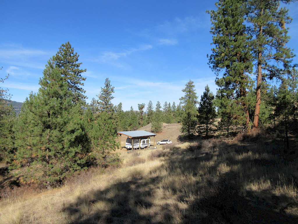 What a quiet place to get-a-way! 20 acres of evergreen trees and meadows. Game trails through out for hiking and exploring. There is a newer RV structure already in place with a 1996 28' Terry Trailer included, nice and clean. This property is great for off-grid camping or living but electricity is not too far away if you prefer.
