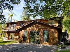Secluded among the trees, easily accessible. Architectural detail, arches and stained glass. Gourmet kitchen with custom cabinetry, stainless steel Kitchen Aid appliances and exquisite Rain Forest Green Serpentine counter-tops. Plenty of room for family and friends in the kitchen w/ built in eating nook and island. Open the kitchen door and spill out onto the back patio or sit down to eat in the formal dining room. Enjoy the look and feel of real Birch hardwood floors throughout the main living areas and down the stairs. Fully finished daylight basement with living room, laundry, two bedrooms and a bonus room. Pellet stove in each living room as well as the large bonus room. The acreage is nicely treed with a sunny lawn area to the south of the home. New HVAC system, one year ago.