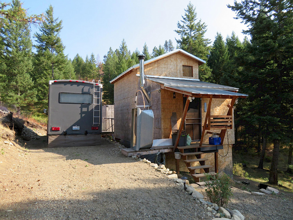 Cool cabin setup out in the woods on 10 acres. Drilled well with a solar pump set-up that pumps into two water storage tanks. This very livable cabin has a loft and covered porch and can be finished to your taste. Also included Class-A motor home is set up as additional living space. There's a separate small shop, large garden area and large chicken coop. The view from this property is incredible from the upper portion of the property. Close to National Forest & the Kettle Crest Trail head.